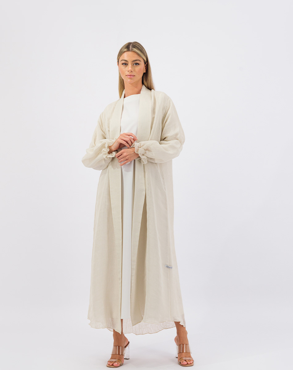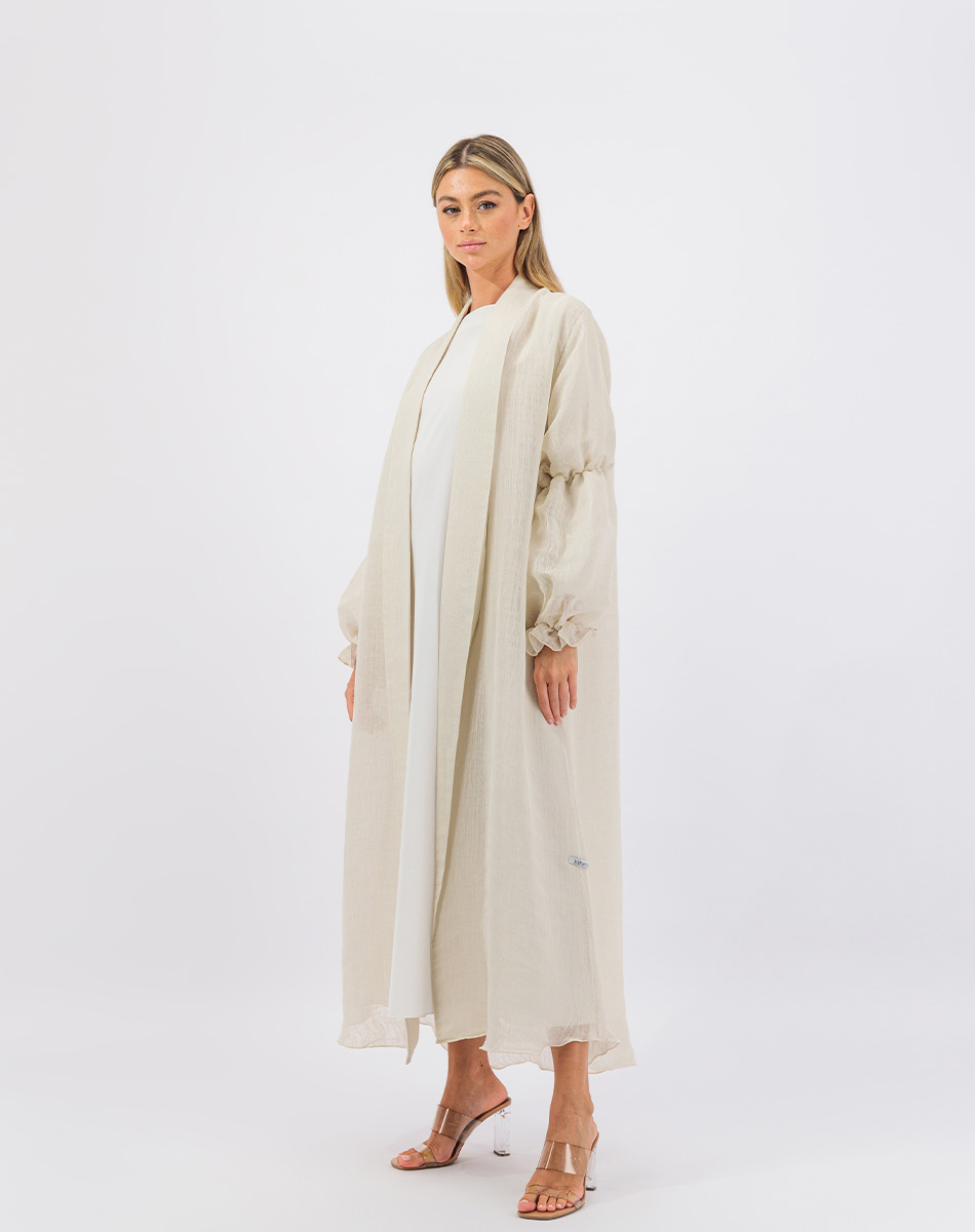 Introducing our elegant Abaya with Gathered Sleeves. Made from special organza fabric, it offers a flattering biased cut and comes with a white sheilah. Perfect for formal events or adding a touch of sophistication to any occasion.
