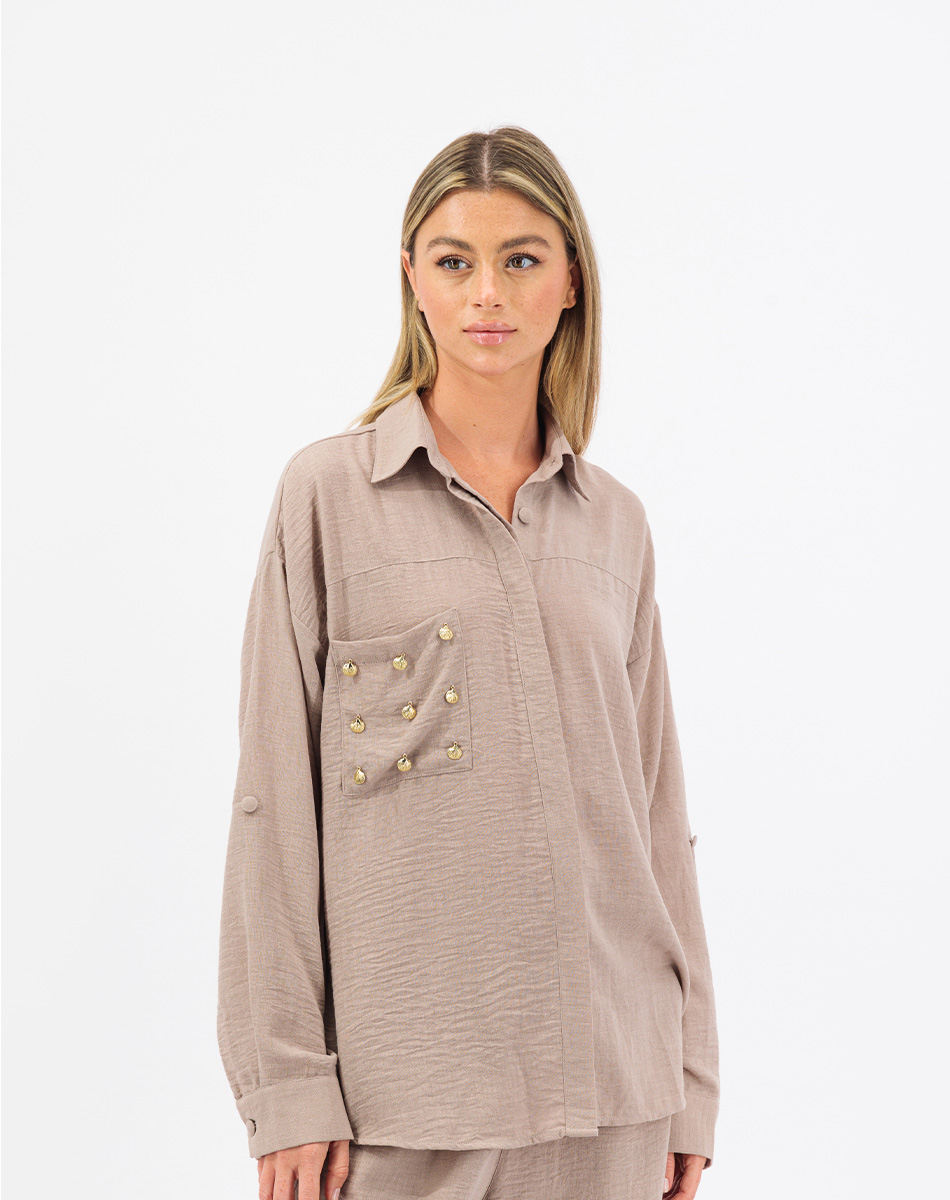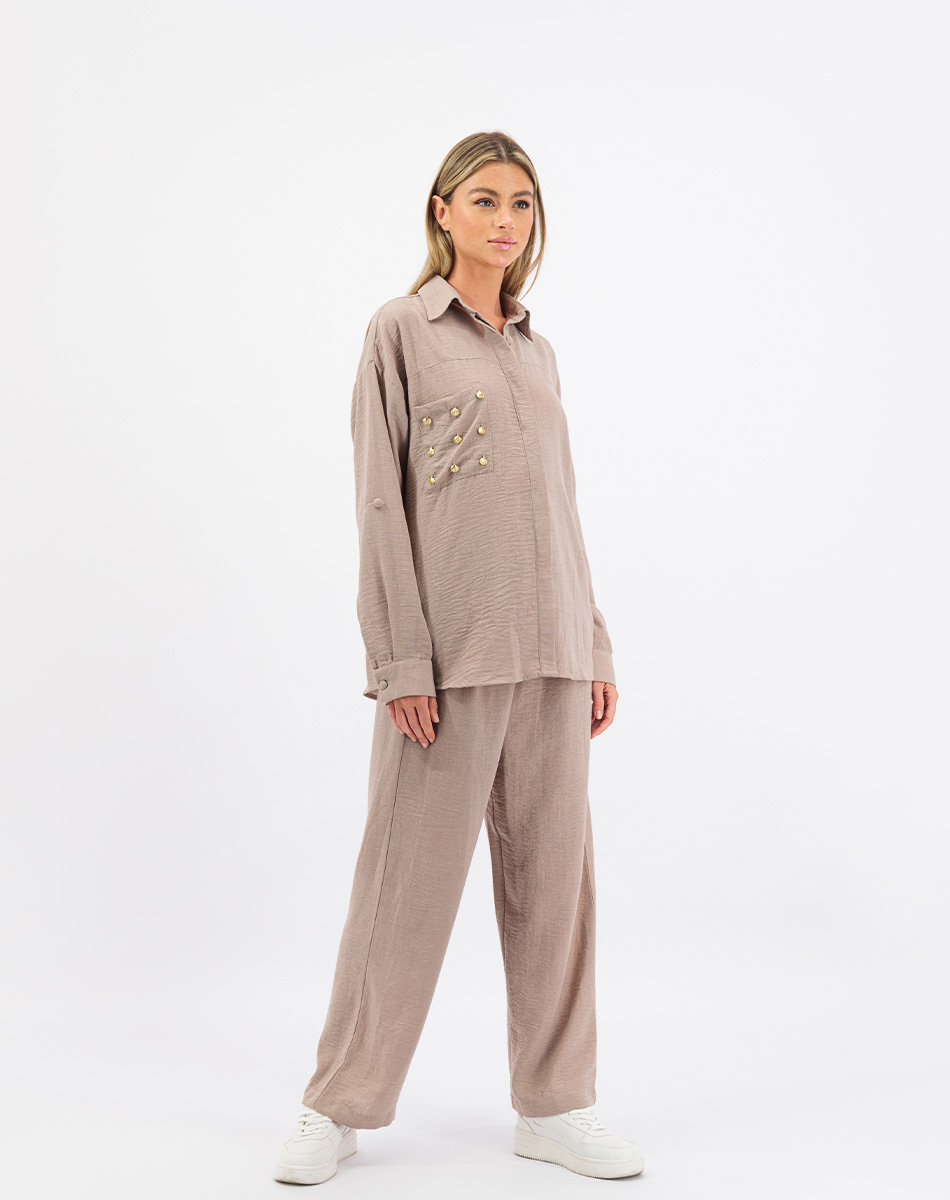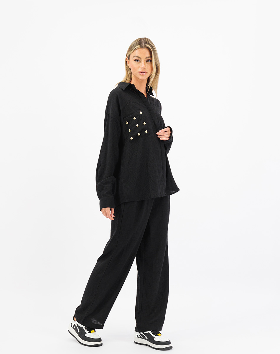 Introducing the summery linen set in pants and flowy shirt embellished with Shells on the Pocket! This elegant set combines comfort with coastal charm. Made from high-quality linen, the pieces feature handcrafted shells on the pocket for a touch of whimsy. The shirt has a button-down design, while the pants offer a tailored fit with a straight leg cut and an elastic waistband. Perfect for casual occasions or warm weather, this set effortlessly blends sophistication and playfulness.