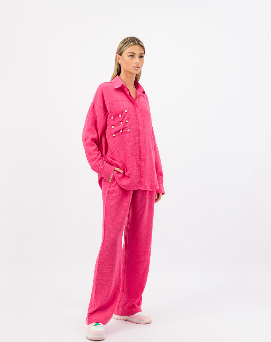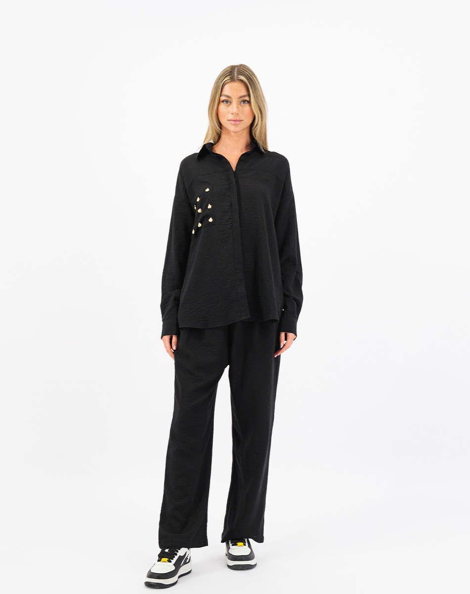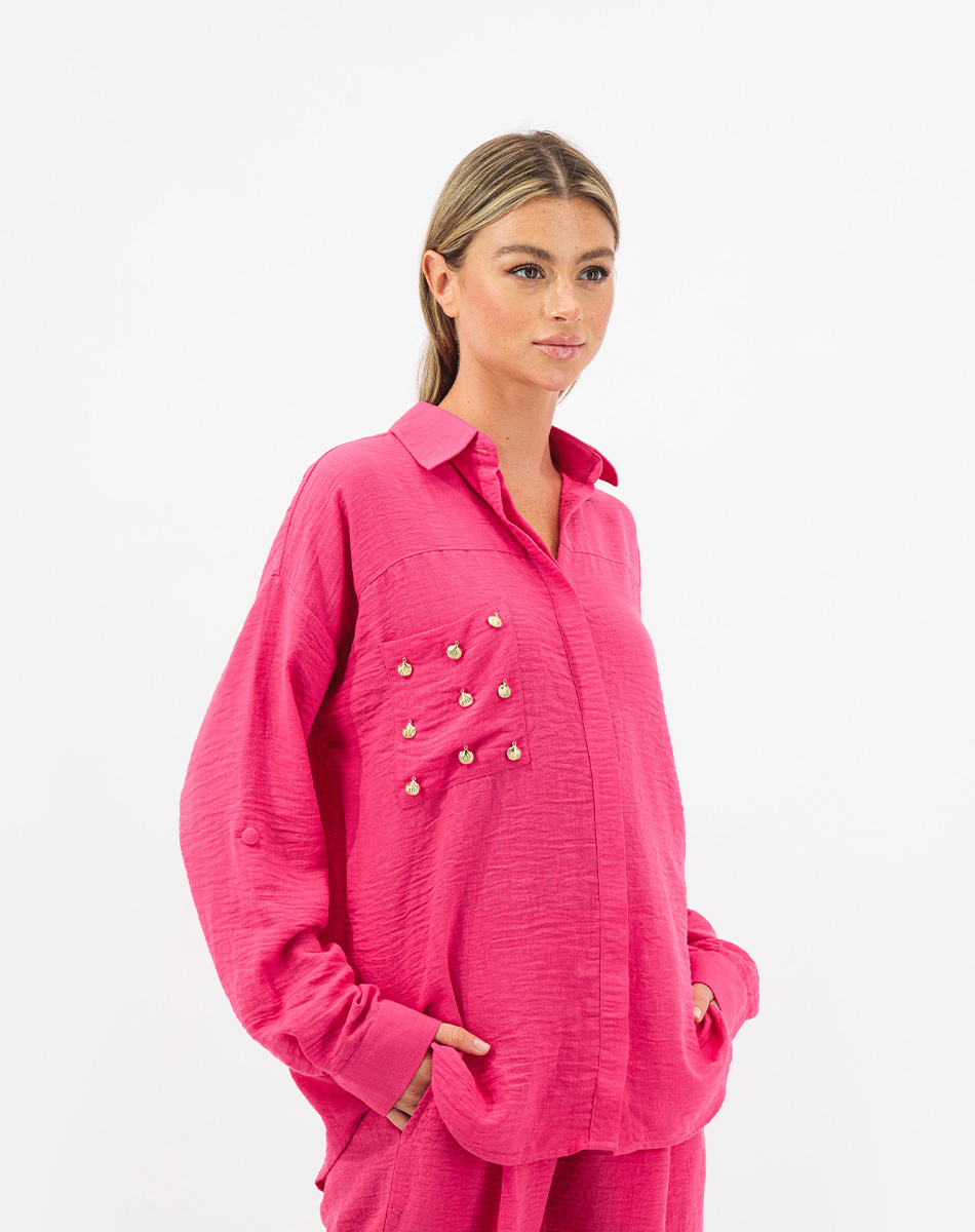 Introducing the summery linen set in pants and flowy shirt embellished with Shells on the Pocket! This elegant set combines comfort with coastal charm. Made from high-quality linen, the pieces feature handcrafted shells on the pocket for a touch of whimsy. The shirt has a button-down design, while the pants offer a tailored fit with a straight leg cut and an elastic waistband. Perfect for casual occasions or warm weather, this set effortlessly blends sophistication and playfulness.